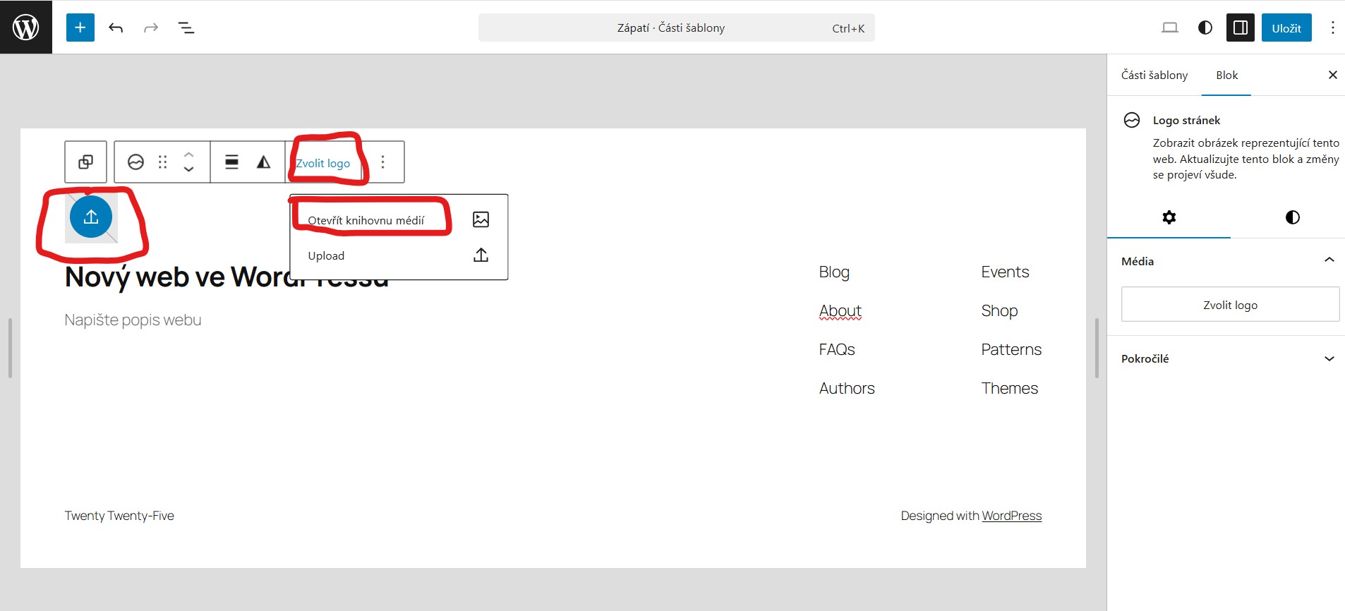 kliknete na šedý rámeček, dále na "Zvolit logo" a na "Otevřít knihovnu médií" a tam najdete svoje logo a vložíte, pokud logo na webu (v knihovně médií) ještě nemáte nahrané, tak kliknete na "Upload" a logo nahrajte z počítače