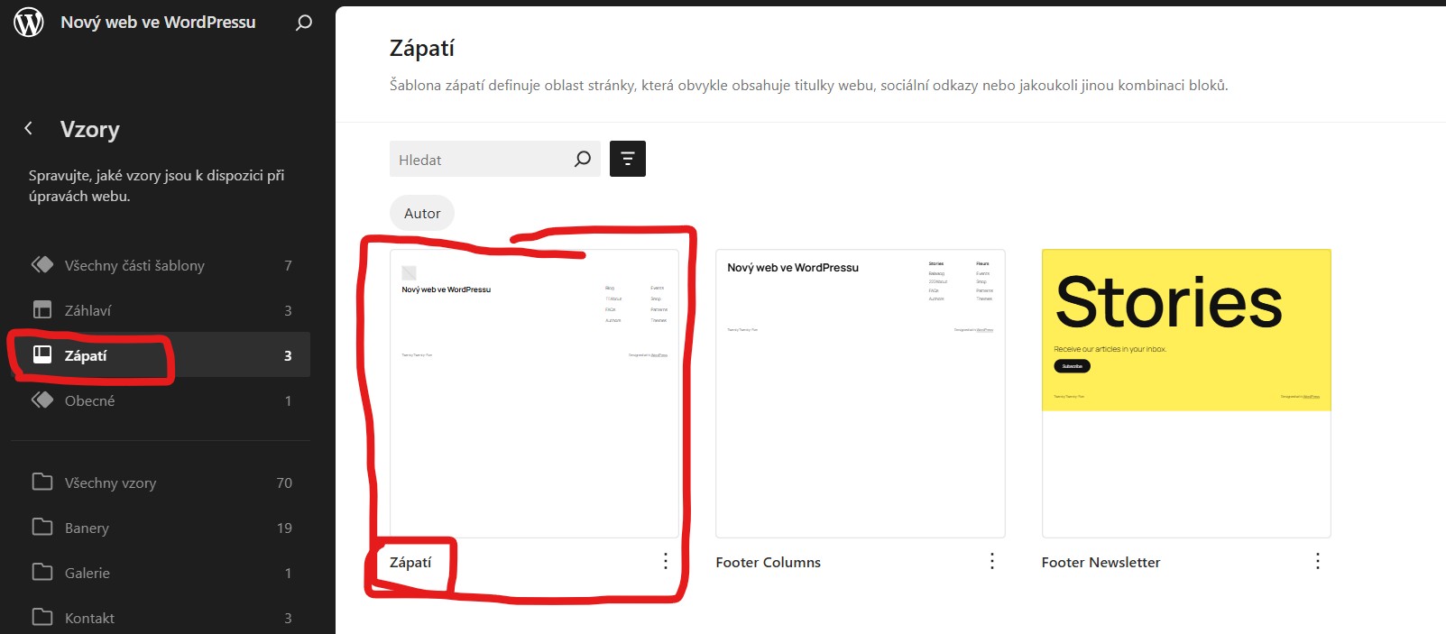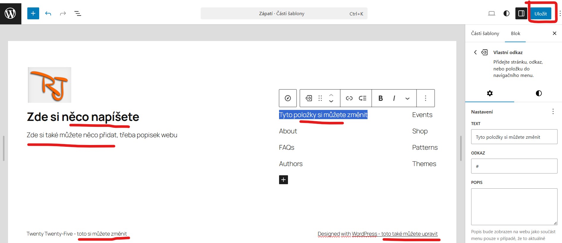Podíváme se jak upravit zápatí webu, jak do něj vkládat položky, odstranit i jak je řadit.